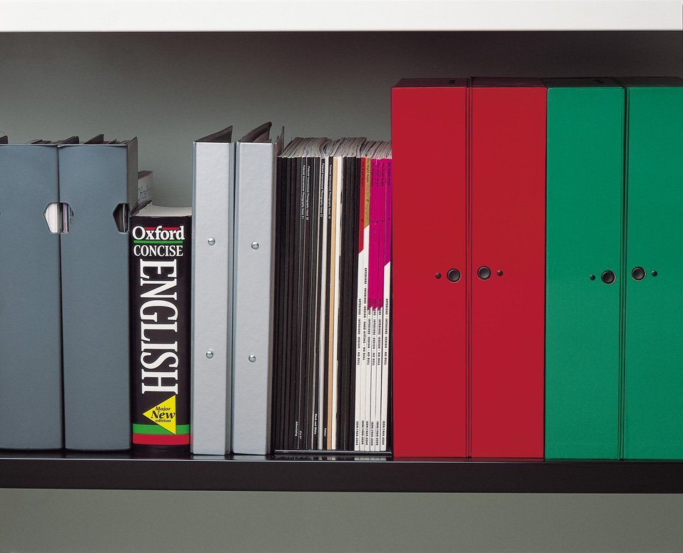 Półka prosta z ramą do zawieszania teczek z etykietą z boku. Pasuje tylko do szaf kombinowanych BISLEY typu SYC i szaf dwudrzwiowych typu SYD.