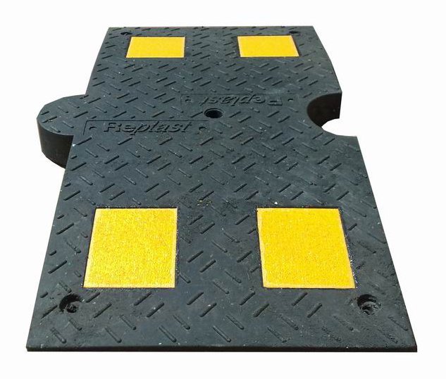 Urządzenia budowlano-ruchowe mające na celu zmniejszenie niepożądanej prędkości pojazdów lub przestrzeganie dopuszczalnych prędkości pojazdów na drogach lokalnych. Zastosowanie – drogi, parkingi, wejścia do budynków. Kolor czarny, do prędkości 30 km/h. Wykonane z trwałego materiału pochodzącego z recyklingu. Dobrze widoczny w nocy. Wysokość 30 x szerokość 500 x głębokość 430 mm.