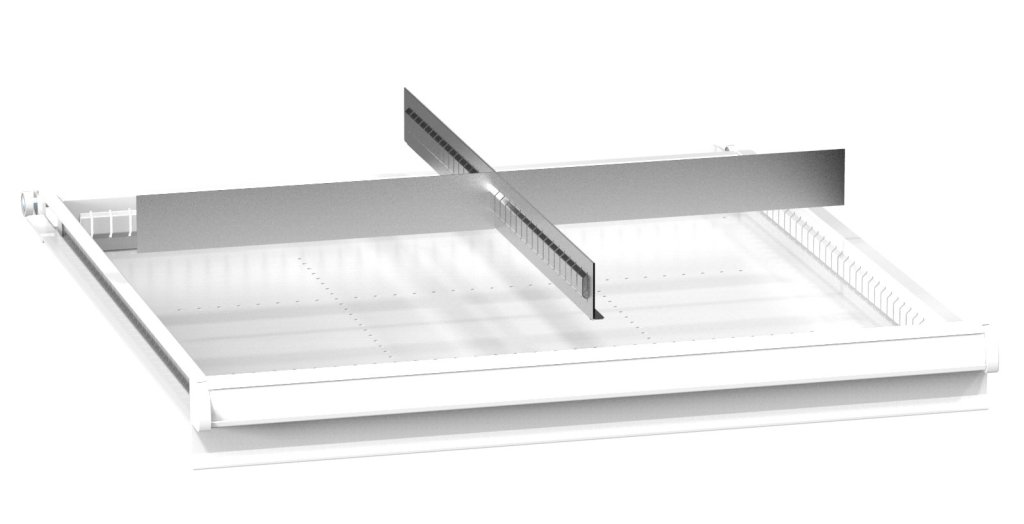 Metalowe przegródki do szuflad, 4 pola, do szuflad ZB (wymiary wewnętrzne szuflady 612 x 612 mm). Do frontu szuflady o wysokości 300 mm.
