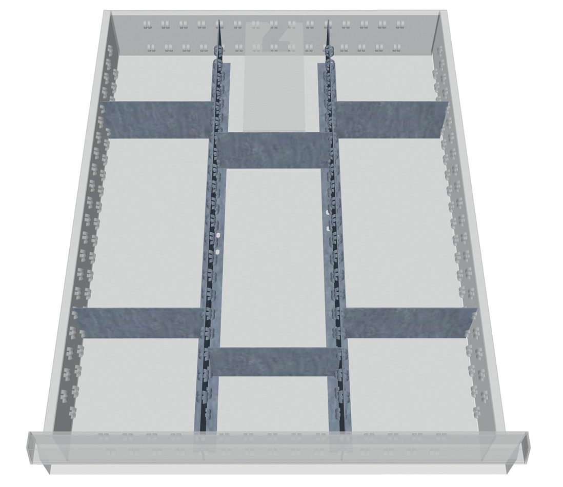Zestaw plastikowych przegródek do szuflad o wysokości 50 - 75 mm. Pasuje wyłącznie do szafek z szufladami Bedrunka+Hirth o szerokości 555 i głębokości 736 mm.