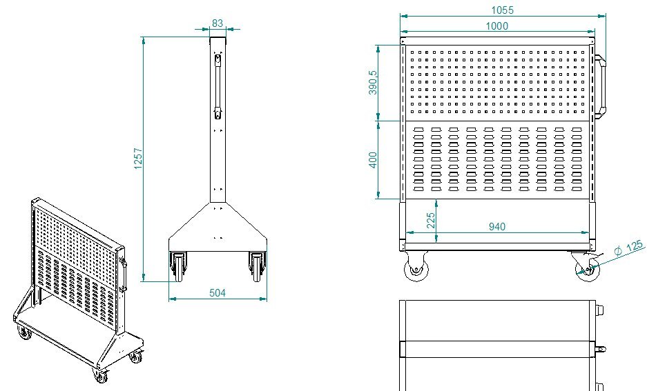 Ramia dwustronnego stacjonarnego panelu perforowanego, do którego można zamontować panele z serii Perfo-plus. Wysokość 1503 x szerokość 1000 x głębokość 504 mm.