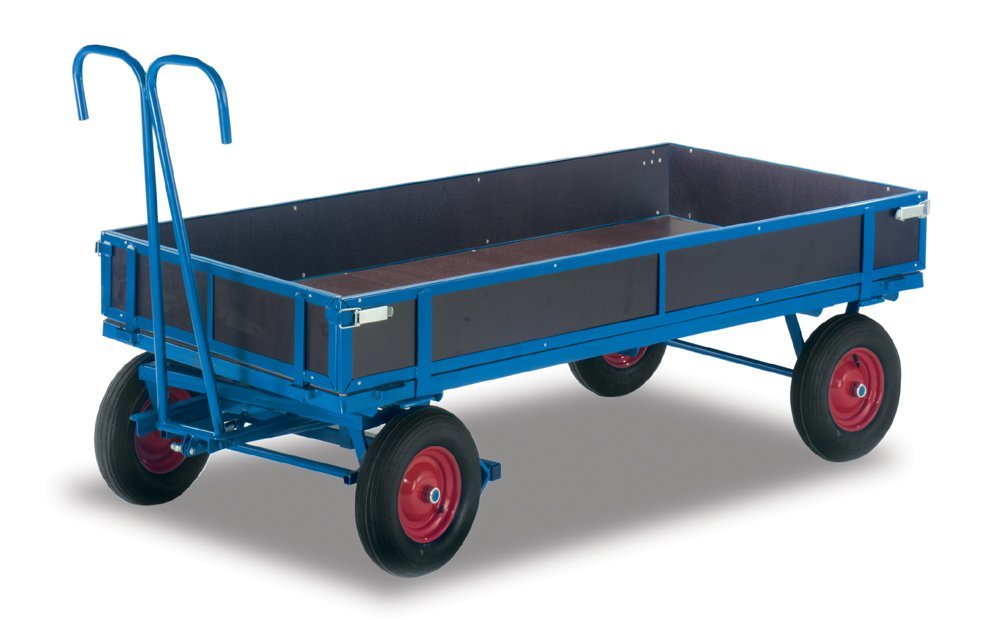 Ręczny samochód ciężarowy burtowy produkcji niemieckiej, konstrukcja wykonana ze spawanych profili stalowych. Powierzchnia do przechowywania z antypoślizgowej, wodoodpornej sklejki. Przedni dwukołowiec posiada kierownicę przegubową, która pozwala na wygodne skręcanie przy w pełni obciążonym wózku. Dyszel wyposażony jest w miękką gumową rączkę. Po zatrzymaniu dyszel podnosi się automatycznie, uruchamiając w ten sposób hamulec przedniego koła. Cztery koła na łożyskach pneumatycznych z automatycznym hamulcem na przednich kołach. Kolor niebieski RAL 5007.