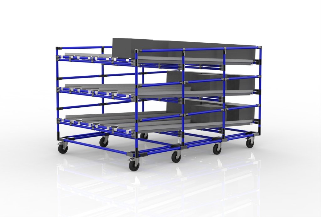 Regał grawitacyjny FIFO z kołami z rurowego systemu modułowego. Zawiera system FIFO (First in, First out), który wykorzystuje pełny opis i parametry