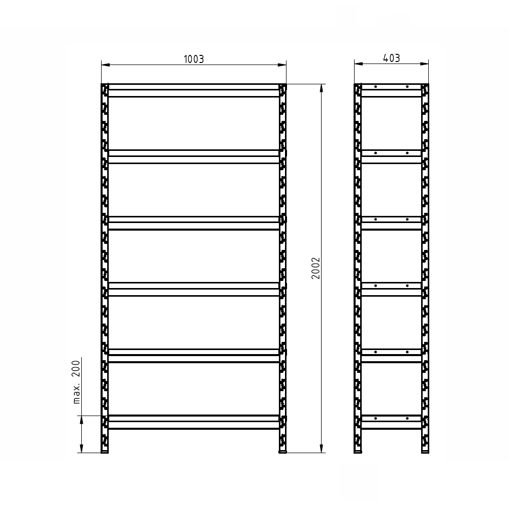 Metalowy regał bezśrubowy przeznaczony do szerokiego zastosowania. Nośność półki jest ustalona na maksymalne równomierne obciążenie 175 kg i służy do przechowywania przedmiotów o średniej wadze. Głębokość półki 400 - 600 mm, szerokość 900 - 1600 mm, wysokość 1770 - 2000 mm, 5 - 6 półek.