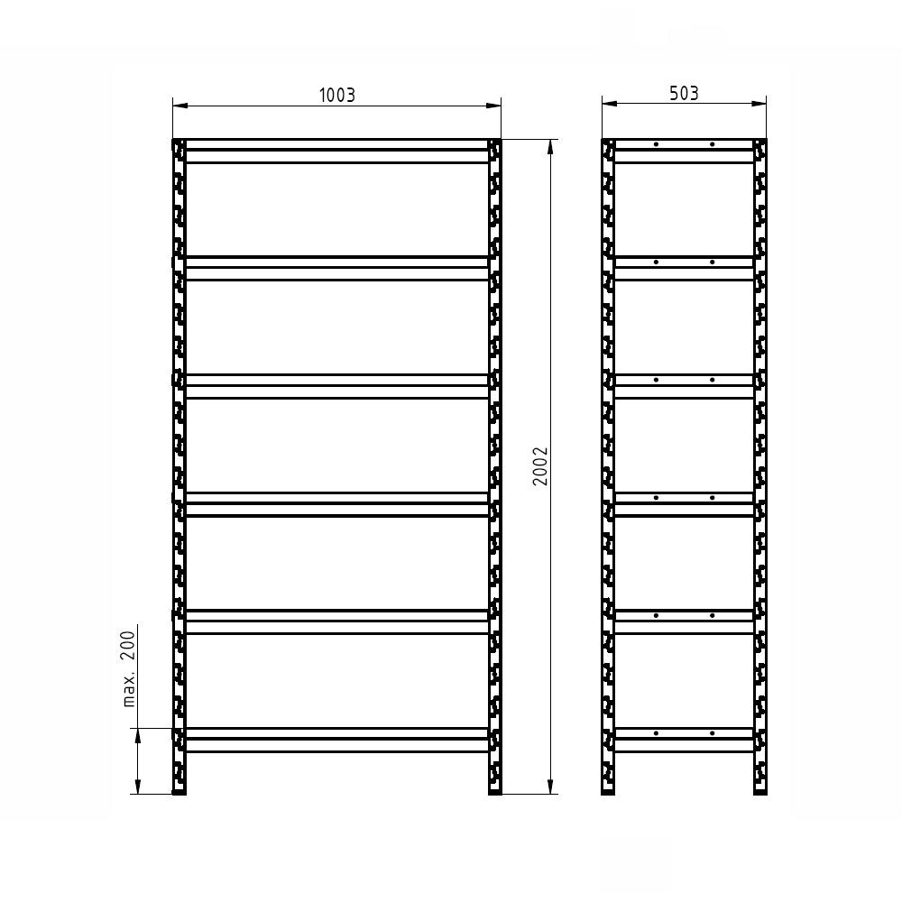 Metalowy regał bezśrubowy przeznaczony do szerokiego zastosowania. Nośność półki jest ustalona na maksymalne równomierne obciążenie 175 kg i służy do przechowywania przedmiotów o średniej wadze. Głębokość półki 400 - 600 mm, szerokość 900 - 1600 mm, wysokość 1770 - 2000 mm, 5 - 6 półek.