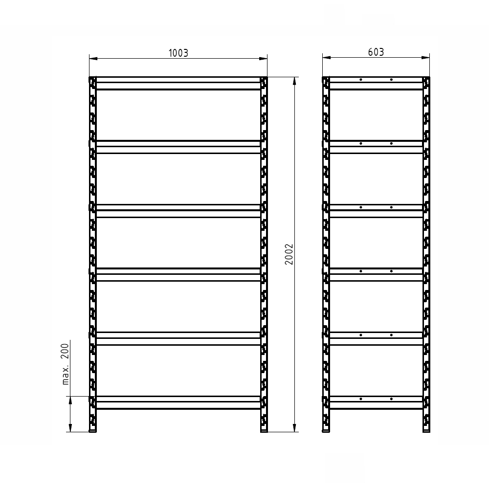 Metalowy regał bezśrubowy przeznaczony do szerokiego zastosowania. Nośność półki jest ustalona na maksymalne równomierne obciążenie 175 kg i służy do przechowywania przedmiotów o średniej wadze. Głębokość półki 400 - 600 mm, szerokość 900 - 1600 mm, wysokość 1770 - 2000 mm, 5 - 6 półek.