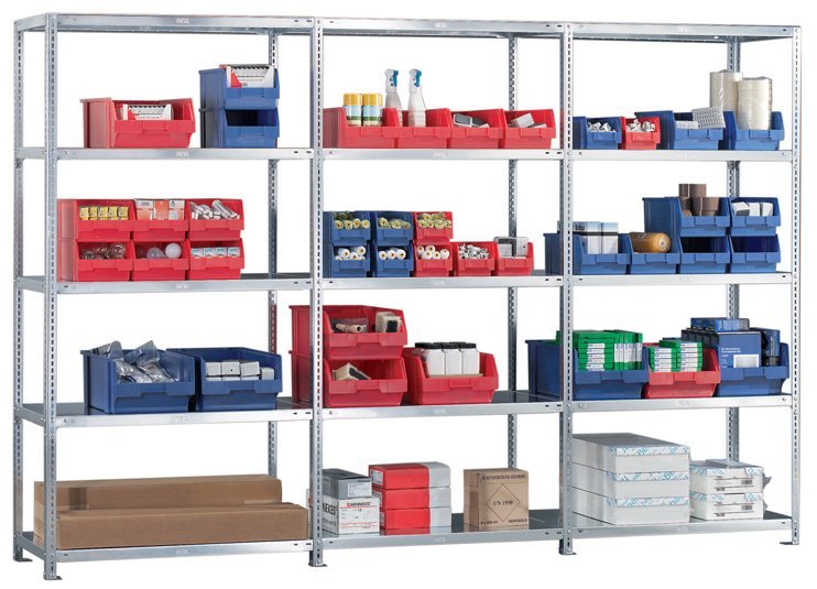 Regał standardowy metalowy półkowy FIX, wersja ocynkowana, głębokość 400 mm, wysokość 2000 mm, szerokość 1000 mm, 5 półek. Możliwość dostawienia do regału standardowego regałów dostawnych na dowolną długość (patrz Dokup dodatkowy). Montaż za pomocą śrub, nośność półki 230 kg.