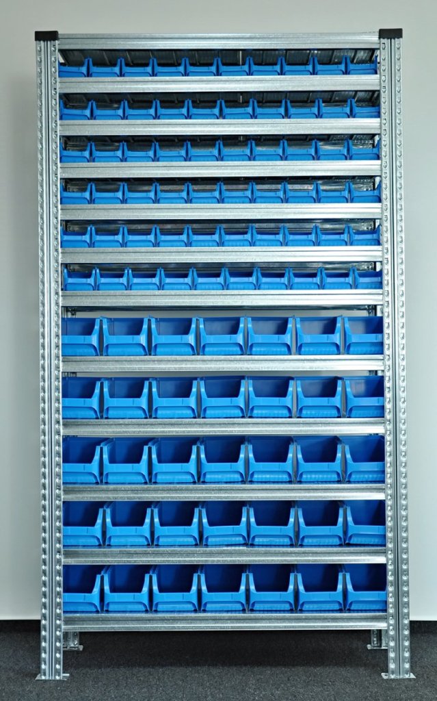 Bezśrubowy regał metalowy z plastikowymi pudełkami. 12 półek, nośność 125 kg, nośność kolumny 1100 kg. Wymiary półki wys. 1972 x szer. 1124 x gł. 330 mm. Zawiera 60x plastikowe pudełko 456232 i 35x plastikowe pudełko 456209. Gwarancja 2 lata.