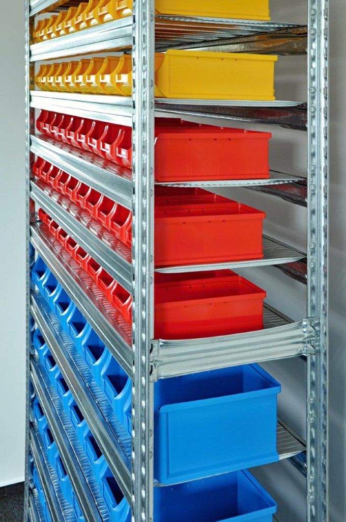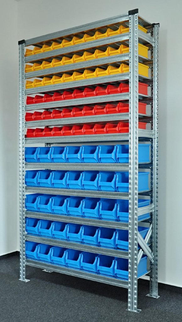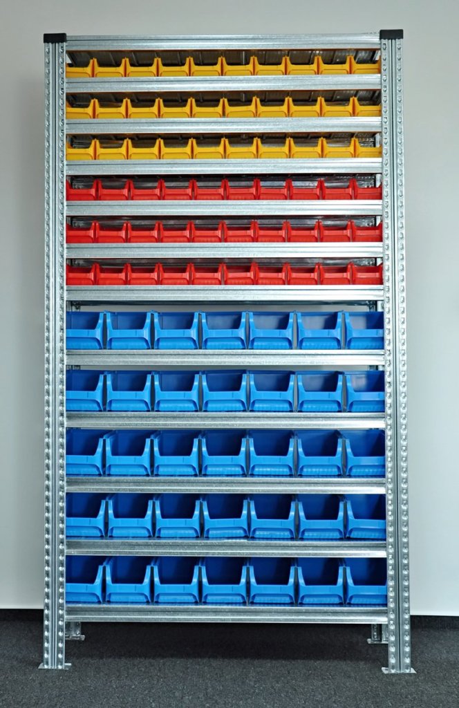 Bezśrubowy regał metalowy z plastikowymi pudełkami. 12 półek, nośność 125 kg, nośność kolumny 1100 kg. Wymiary półki wys. 1972 x szer. 1124 x gł. 330 mm. Zawiera 60x plastikowe pudełko 456232 i 35x plastikowe pudełko 456209. Gwarancja 2 lata.