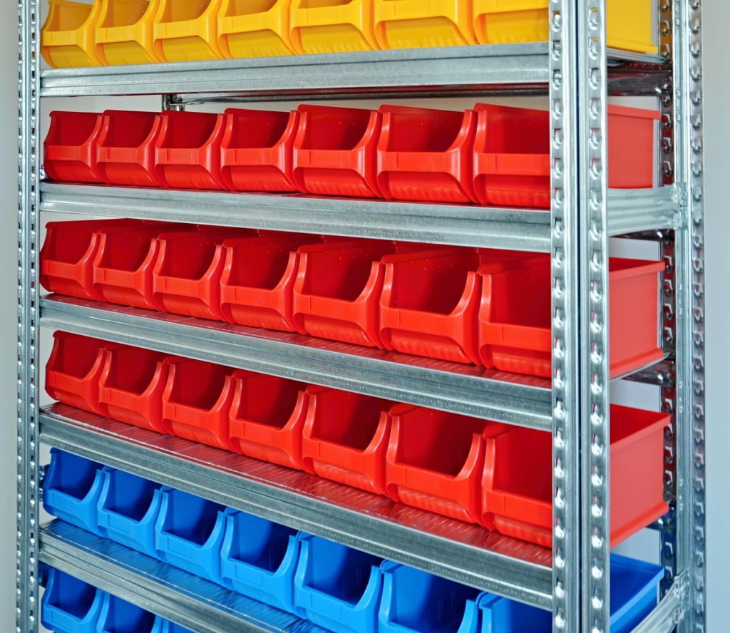 Bezśrubowy regał półkowy metalowy z plastikowymi pudełkami. 10x półek, nośność 125 kg, nośność kolumny 1100 kg. Wymiary półki wys. 1972 x szer. 1124 x gł. 330 mm. Zawiera 28x plastikowe pudełko 456210 i 35x plastikowe pudełko 456208. Gwarancja 2 lata.