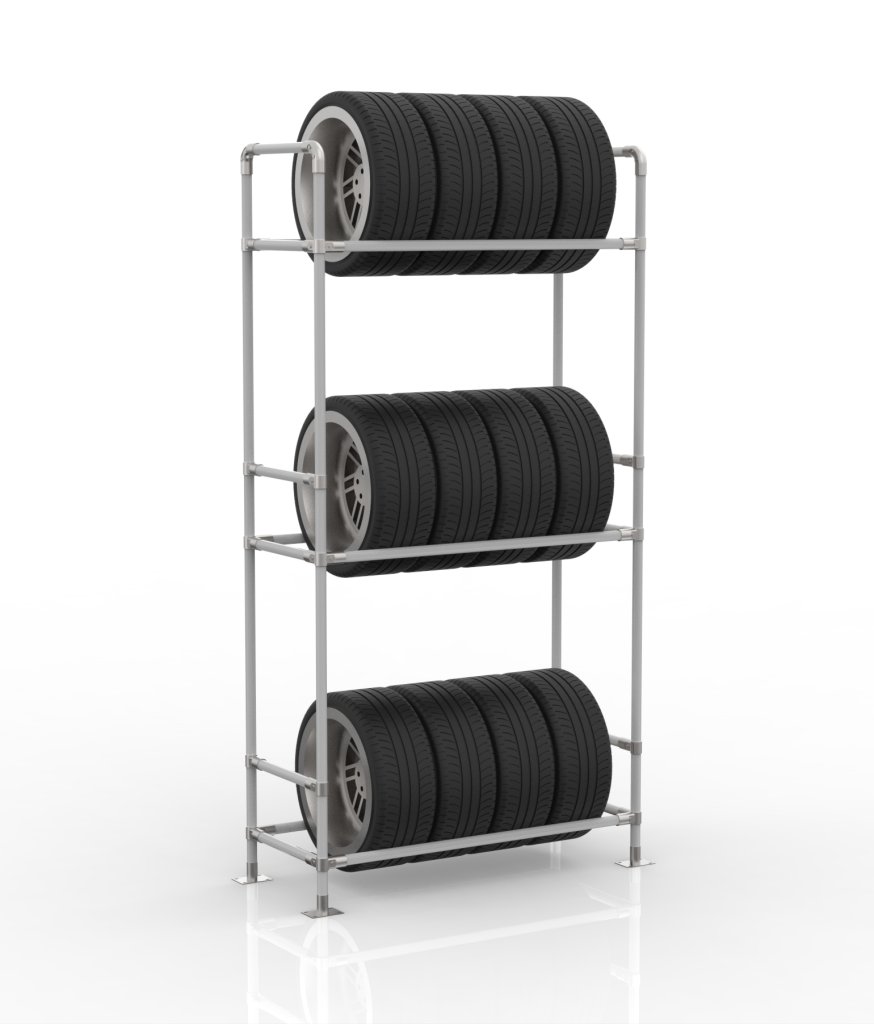 Regał na opony z systemu modułowego z rurkami z trzema półkami. Praktyczne przechowywanie do 12 opon na trzech poziomach. Idealny pełny opis i parametry