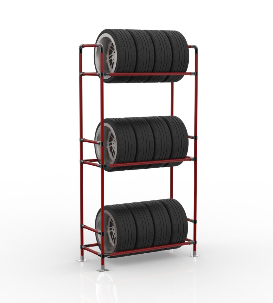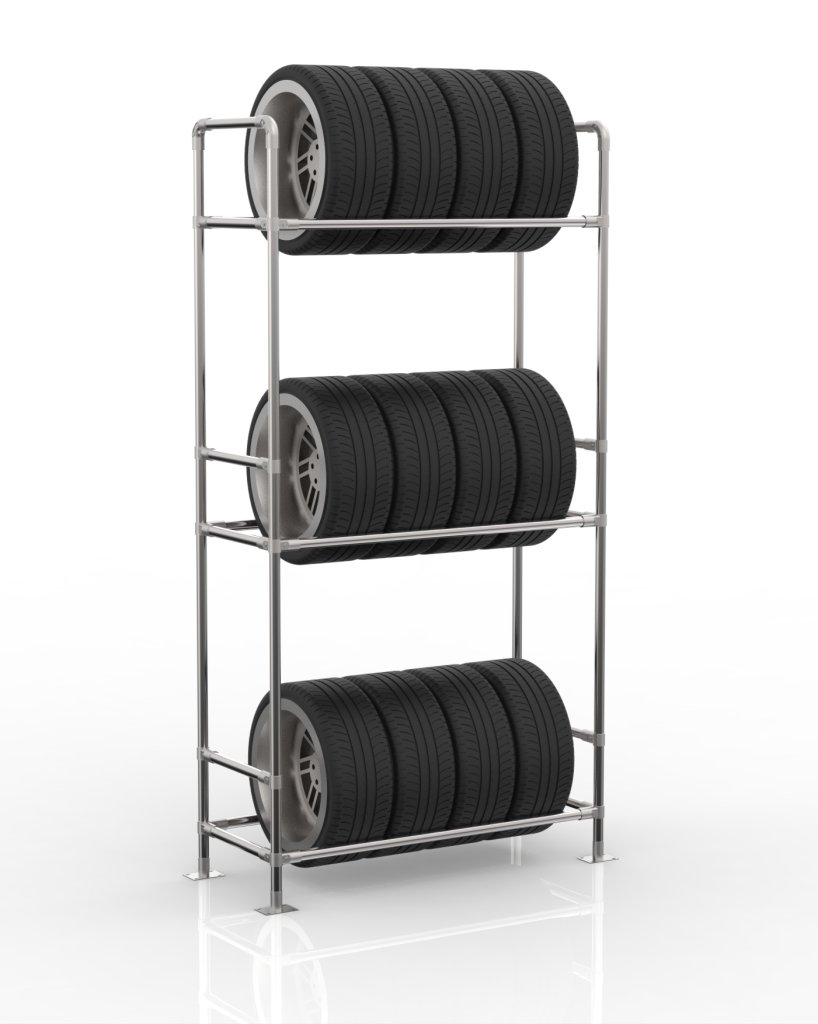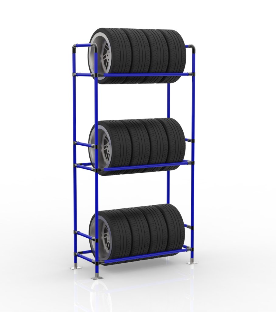 Regał na opony z systemu modułowego z rurkami z trzema półkami. Praktyczne przechowywanie do 12 opon na trzech poziomach. Idealny pełny opis i parametry