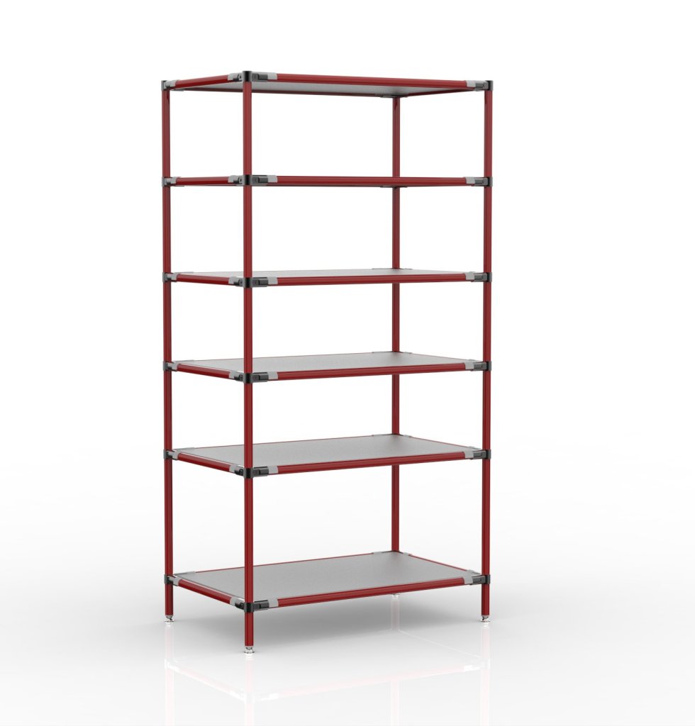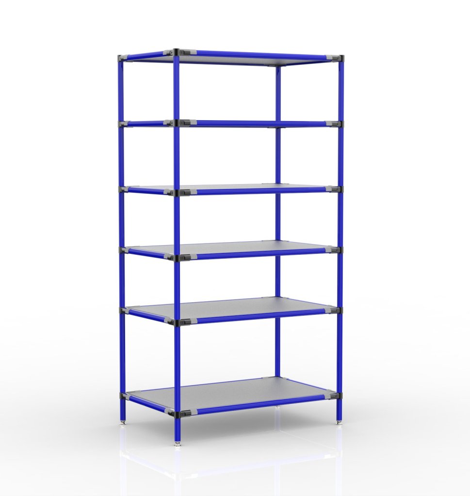 Regał wykonany z rurowego systemu modułowego z sześcioma prostymi półkami jest praktycznym pomocnikiem. Zapewnia przejrzyste przechowywanie towarów, dokumentów czy narzędzi. Częścią półki jest płyta laminowana o grubości 18 mm. Całkowite obciążenie 300 kg, nośność na półkę 50 kg. Wymiary 1850 x 963 x 603 mm.