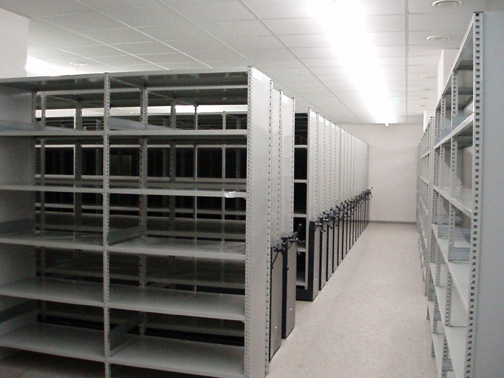 Projekt półek: malowane środniki i półki - RAL 7035 jasnoszary, malowane podwozie i kliny bieżnika - RAL 7016 ciemnoszary, szyny - ocynkowane, łączenia boczne, haki, wzmocnienia, materiał łączący, elementy wentylacyjne. System szynowy składa się z szyn, klinów bieżnikowych przy szynach zewnętrznych - 2 szt. oraz płyty wiórowej pokrytej liną pomiędzy szynami. Zestaw ten obejmuje również 1–6 wybranych podwozi (rzędów), każdy z 4 półkami o szerokości 4 x 1030 mm, wysokość półek wynosi 2160 mm (wraz z podwoziem i szynami), wysokość ta obejmuje 5 półek do przechowywania i jedną okładkę (czyli 5+1). Głębokość półki 300 mm. Nośność półki wynosi co najmniej 130 kg.