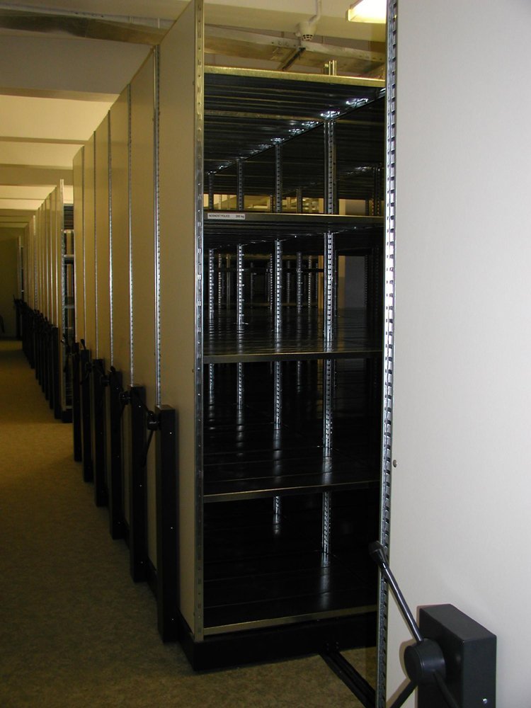 Projekt półek: malowane środniki i półki - RAL 7035 jasnoszary, malowane podwozie i kliny bieżnika - RAL 7016 ciemnoszary, szyny - ocynkowane, łączenia boczne, haki, wzmocnienia, materiał łączący, elementy wentylacyjne. System szynowy składa się z szyn, klinów bieżnikowych przy szynach zewnętrznych - 2 szt. oraz płyty wiórowej pokrytej liną pomiędzy szynami. Zestaw ten obejmuje również 1–6 wybranych podwozi (rzędów), każdy z 4 półkami o szerokości 4 x 1030 mm, wysokość półek wynosi 2160 mm (wraz z podwoziem i szynami), wysokość ta obejmuje 5 półek do przechowywania i jedną okładkę (czyli 5+1). Głębokość półki 300 mm. Nośność półki wynosi co najmniej 130 kg.