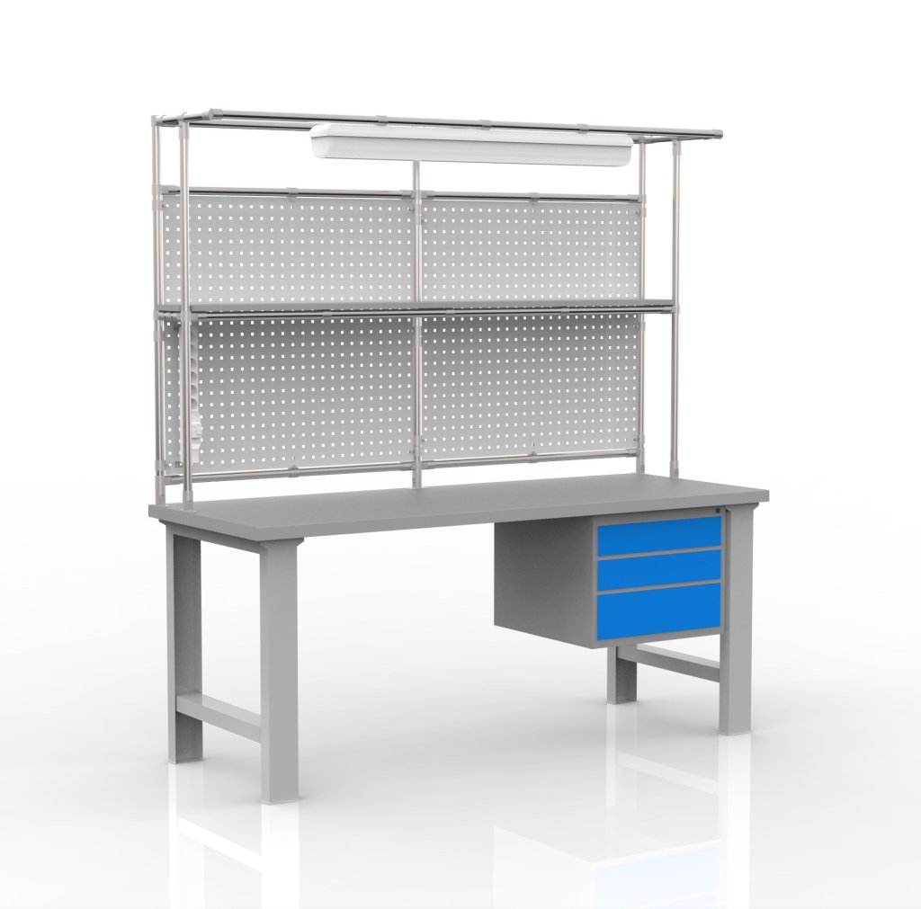 Regulowany na wysokość stół warsztatowy z nadbudową z systemu rurowego. Stół zawiera blat roboczy z klejonki bukowej, podwieszany kontener z trzema szufladami, perforowaną tablicę do zawieszania skrzynek lub narzędzi, półkę z płyty laminowanej, gniazdo z wyłącznikiem oraz oświetlenie LED. Wysokość powierzchni roboczej regulowana w zakresie od 830 do 1070 mm. Nośność przy równomiernym obciążeniu wynosi 300 kg, nośność półki 30 kg. Wymiary 2080 x 2000 x 750 mm.