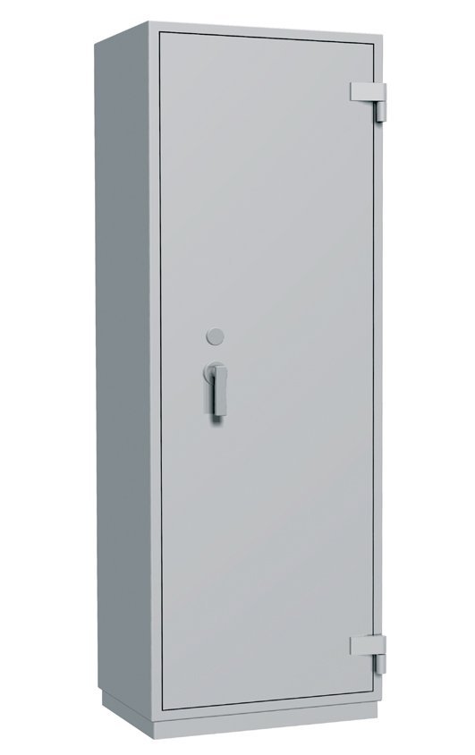 Sejf jednodrzwiowy o podwyższonej odporności ogniowej, 3 półki regulowane, zamykany na kluczyk sejfowy. Klasa bezpieczeństwa 0, przystosowana do przechowywania dokumentów z klauzulą "Poufne". Wysokość 1950 x szerokość 700 x głębokość 550 mm, waga 320 kg, kolor jasnoszary RAL 7035.