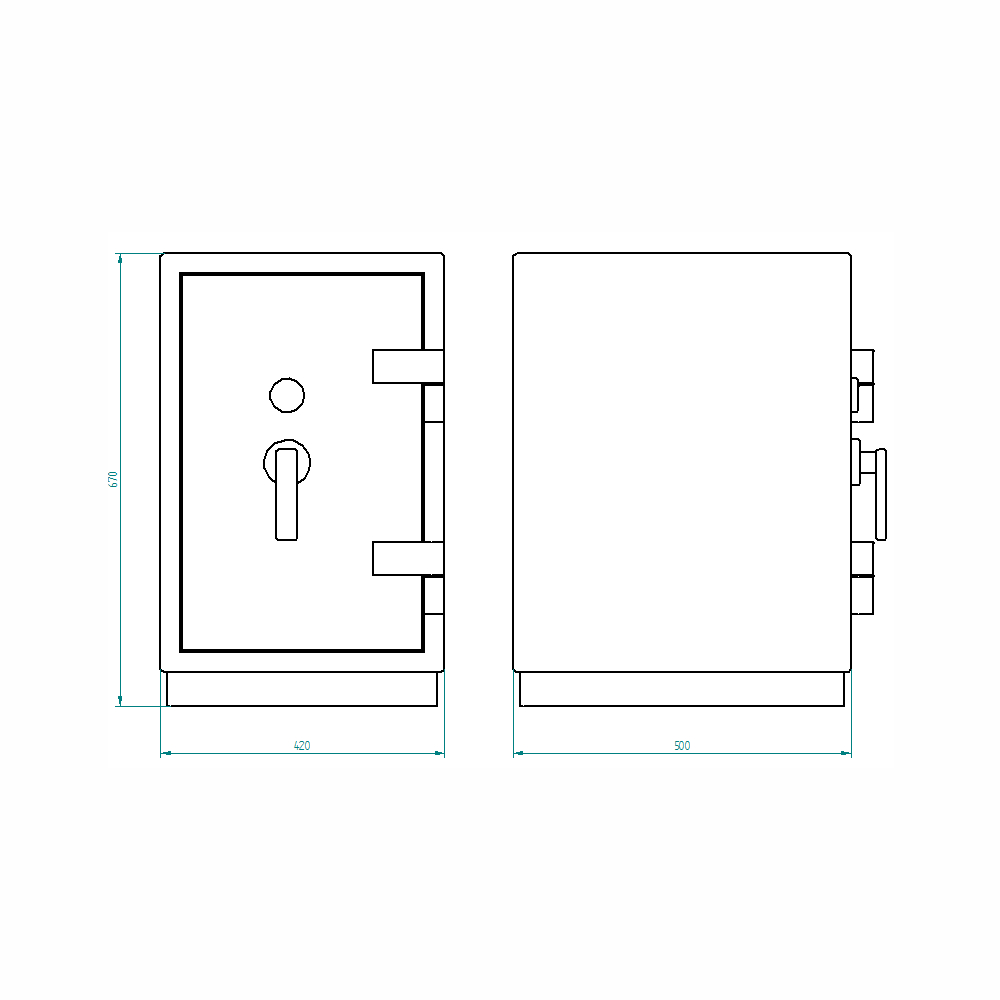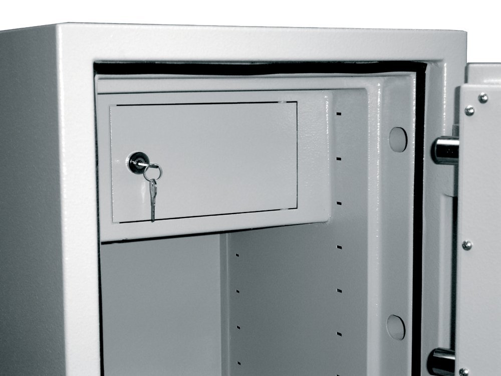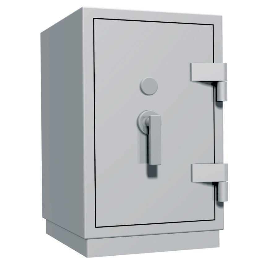 Sejf o podwyższonej odporności ogniowej, skrzynka wewnętrzna, zamykana na kluczyk. Klasa bezpieczeństwa 1, klasyfikacja w-g MON - przeznaczona dla dokumentów z klauzulą "Tajne". Wysokość 670 x szerokość 420 x głębokość 500 mm, waga 105 kg, kolor jasnoszary RAL 7035.