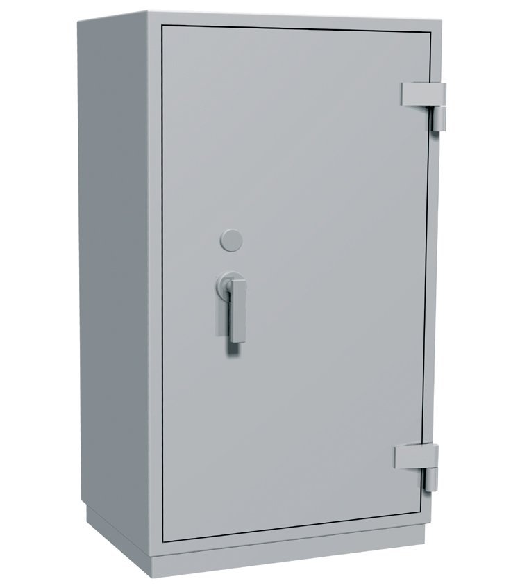 Sejf o podwyższonej odporności ogniowej, 2 półki, zamykany na kluczyk sejfowy. Klasa bezpieczeństwa I, klasyfikacja w-g MON - przeznaczona dla dokumentów z klauzulą "Tajne". Wysokość 1210 x szerokość 700 x głębokość 500 mm, waga 215 kg, kolor jasnoszary RAL 7035.