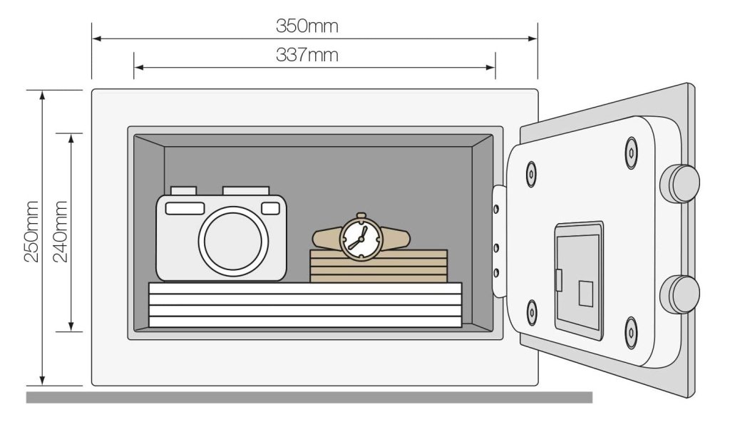 Sejf meblowy Yale Value Medium, zamek elektroniczny, bez wyświetlacza, zamek dwustronny dźwigniowy. Wysokość 250 x szerokość 350 x głębokość 250 mm, wymiary wewnętrzne 240 x 340 x 200 mm.