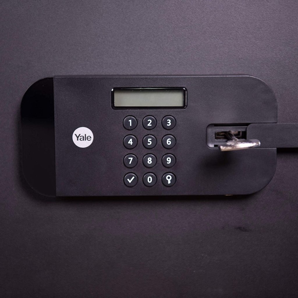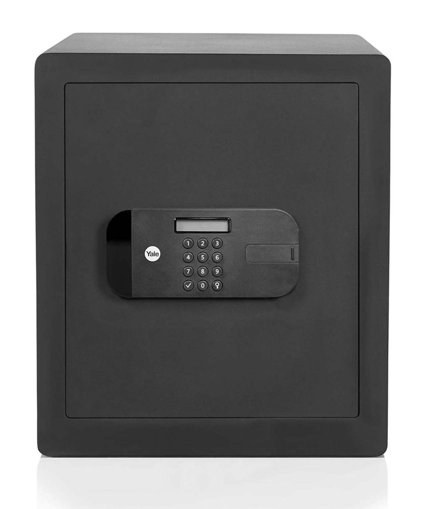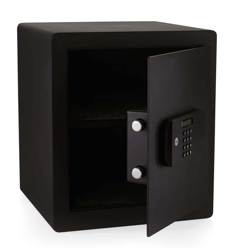 Mały sejf domowy, meblowy Yale Value, zamek elektroniczny, bez wyświetlacza, zamek dwustronny dźwigniowy. Wysokość 200 x szerokość 310 x głębokość 200 mm, wymiary wewnętrzne 190 x 300 x 150 mm.