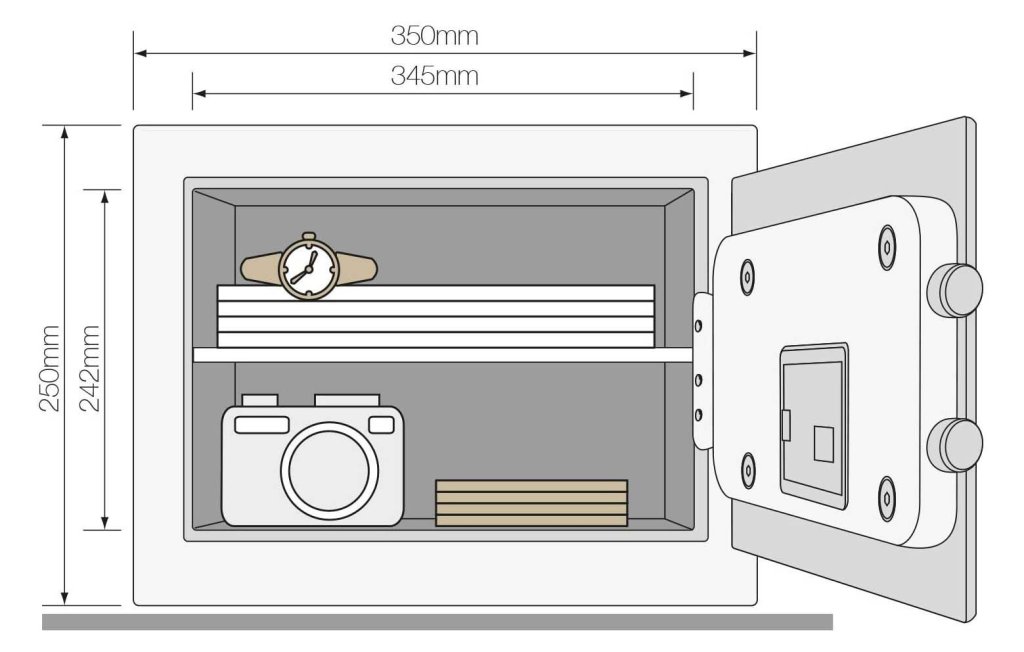 Sejf meblowy Yale Value Medium, zamek elektroniczny, bez wyświetlacza, zamek dwustronny dźwigniowy. Wysokość 250 x szerokość 350 x głębokość 250 mm, wymiary wewnętrzne 240 x 340 x 200 mm.