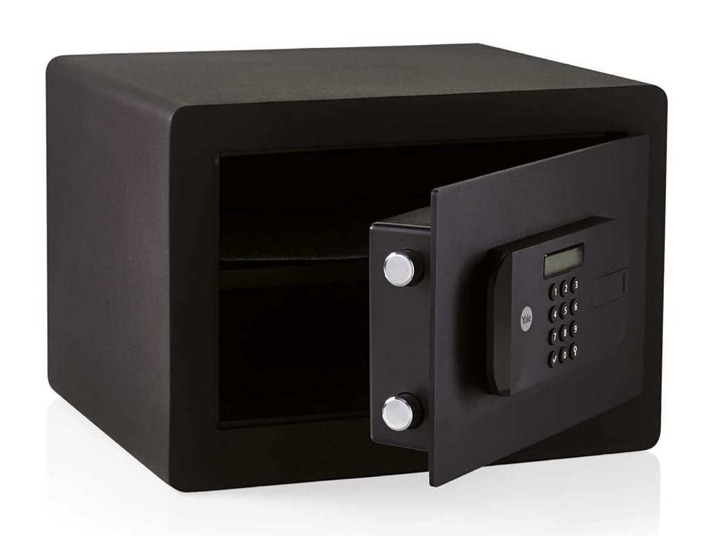 Mały sejf domowy, meblowy Yale Value, zamek elektroniczny, bez wyświetlacza, zamek dwustronny dźwigniowy. Wysokość 200 x szerokość 310 x głębokość 200 mm, wymiary wewnętrzne 190 x 300 x 150 mm.