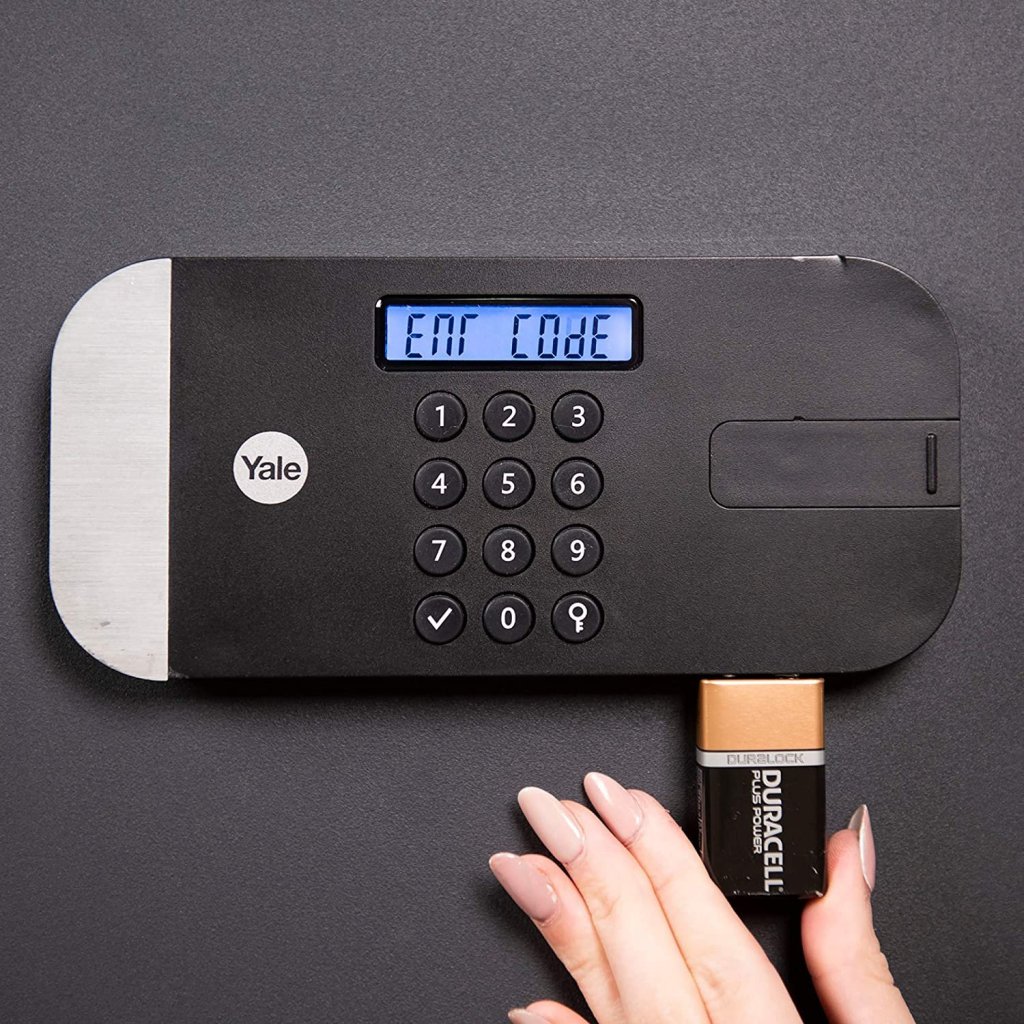 Mały sejf domowy Yale Guest, meblowy, elektroniczny zamek szyfrowy, wyświetlacz podświetlany na niebiesko, dwustronny system zamykania dźwigniowy. Wysokość 200 x szerokość 310 x głębokość 200 mm, wymiary wewnętrzne 197 x 307 x 137 mm.