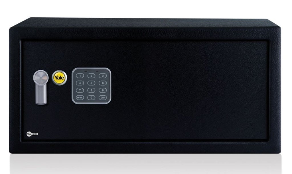Yale Value Duży sejf hotelowy meblowy, zamek elektroniczny, bez wyświetlacza, zamek dwustronny dźwigniowy. Wysokość 390 x szerokość 350 x głębokość 360 mm, wymiary wewnętrzne 380 x 340 x 310 mm.