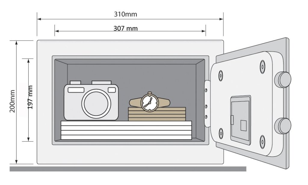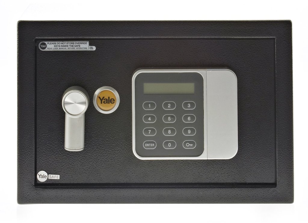 Mały sejf domowy, meblowy Yale Value, zamek elektroniczny, bez wyświetlacza, zamek dwustronny dźwigniowy. Wysokość 200 x szerokość 310 x głębokość 200 mm, wymiary wewnętrzne 190 x 300 x 150 mm.