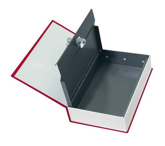 Zamykany sejf imitujący książkę. Wysokość 240 x szerokość 155 x głębokość 55 mm. Materiał stal ocynkowana, zamek niewidoczny.