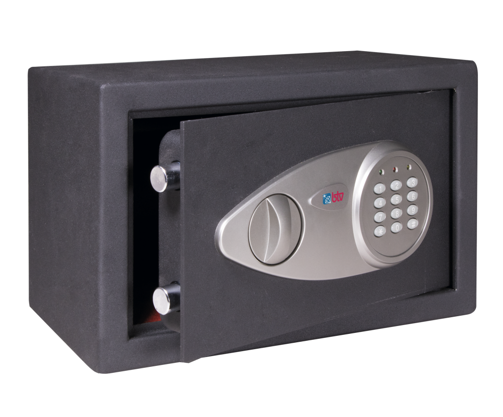 Sejf meblowy z elektronicznym zamkiem szyfrowym + klucz awaryjny. Wysokość 200 x szerokość 310 x głębokość 200 mm. Zasilany 4 bateriami ołówkowymi 1,5 V.