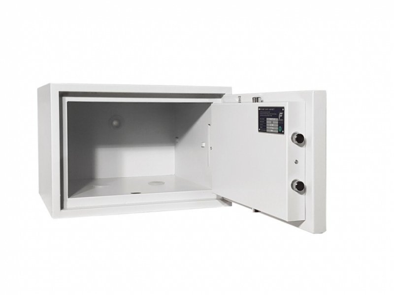 Sejf meblowy dwuwarstwowy w niecertyfikowanej klasie bezpieczeństwa S2. Wysokość 300 x szerokość 445 x głębokość 400 mm, zamykanie na klucz lub kod elektroniczny, kolor RAL 7035
