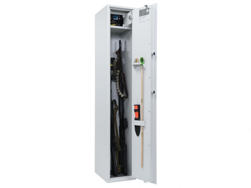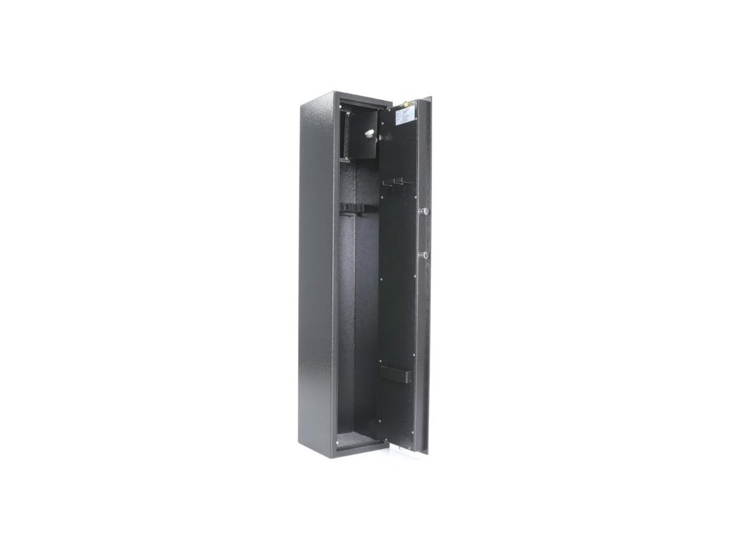 Sejf na 5 sztuk broni długiej z wewnętrzną skrzynką na amunicję. Wymiary 1450 x 255 x 345 mm. pełny opis i parametry