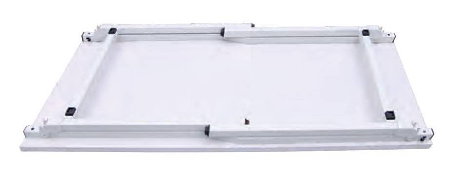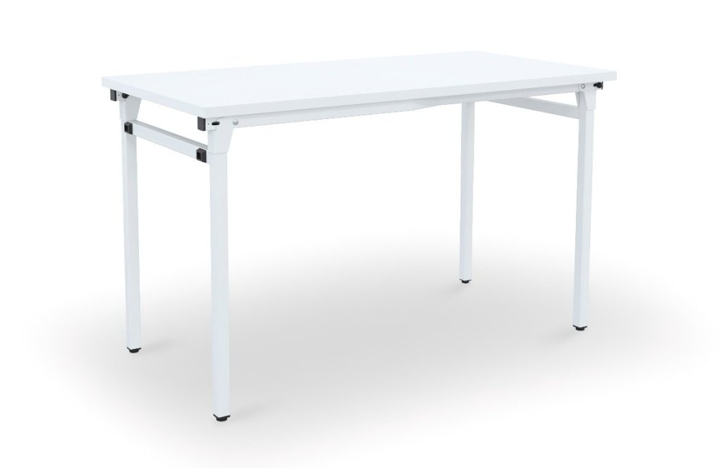 Składany stół konferencyjny na metalowej podstawie, wymiary płyty 1200 x 600 mm, kolor konstrukcji RAL 7035, kolor płyty biały. Powierzchnia robocza wykonana jest z płyty wiórowej dwustronnie laminowanej o grubości 25 mm, oklejonej obrzeżem ABS. Wysokość blatu po rozłożeniu wynosi 720 mm. Wysokość stołu po złożeniu 95 mm. Bezpieczne plastikowe nakładki. Szybkie i bezpieczne rozkładanie i składanie stołu.