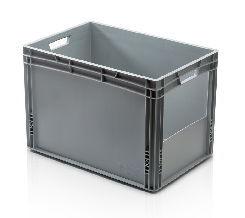 Skrzynia europejska z możliwością układania w stosy, odpowiednia do długotrwałego przechowywania i produkcji. Jest stabilny w transporcie, kompatybilny z europaletami. Posiada solidne dno i boki z zamykanymi uchwytami. Kolor szary. Objętość 54 l.