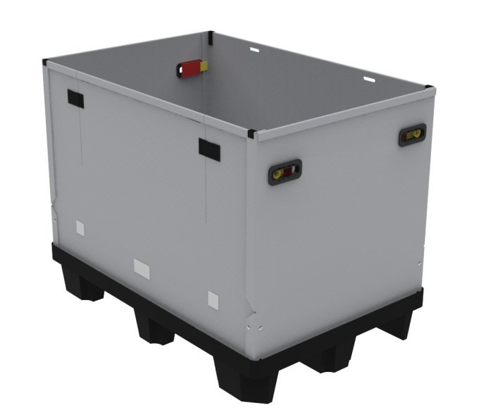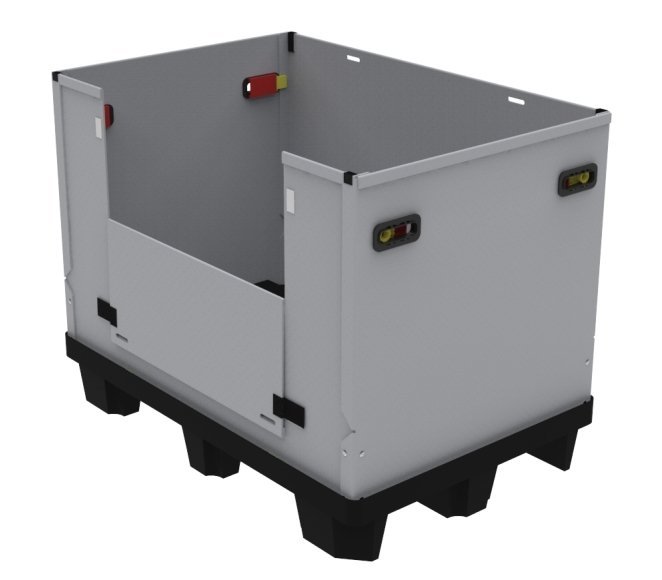 Skrzyniopaleta charakteryzuje się maksymalną objętością użytkową w stanie rozłożonym i minimalnymi rozmiarami w stanie złożonym. Idealna do obsługi, przechowywania i systemu opakowań zwrotnych. Wysokość 924 x szerokość 1215 x głębokość 815 mm. Drzwi po jednej stronie.
