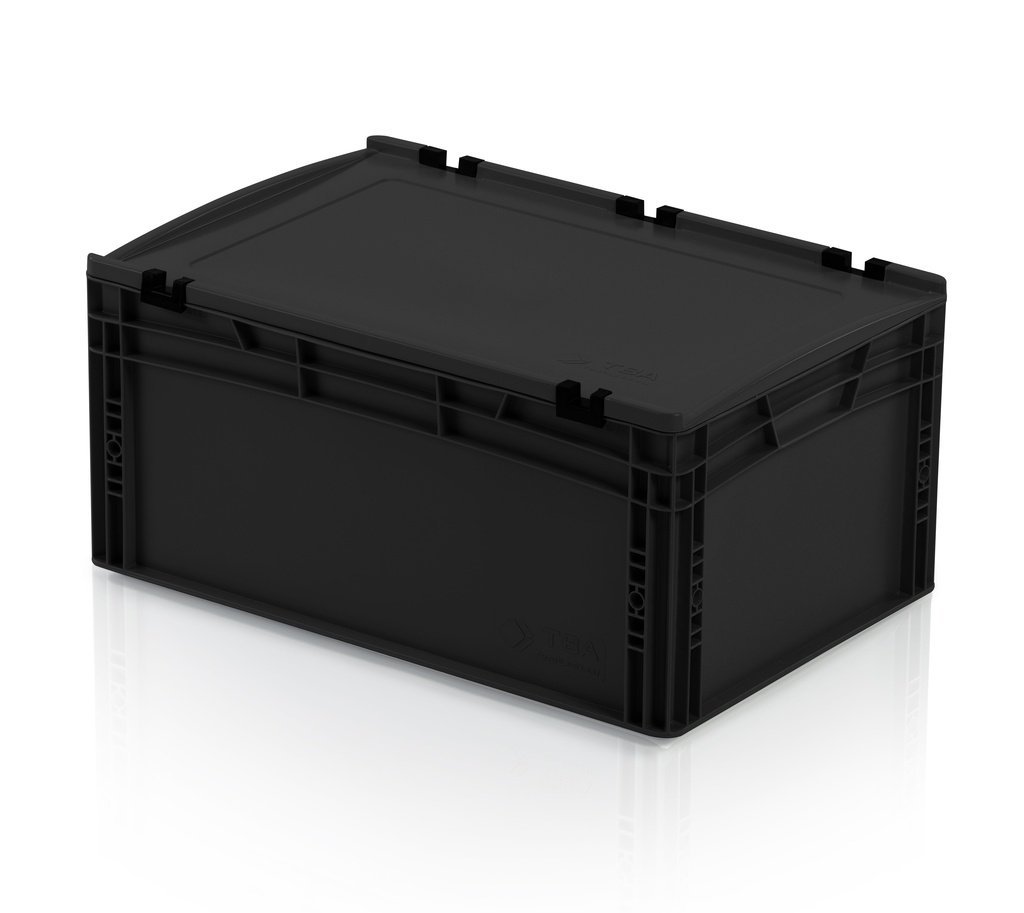 Skrzynię ESD Euro z pokrywką można łatwo układać w stosy. Zapobiega tworzeniu się ładunków elektrostatycznych. specyfikacja opór pełny opis i parametry