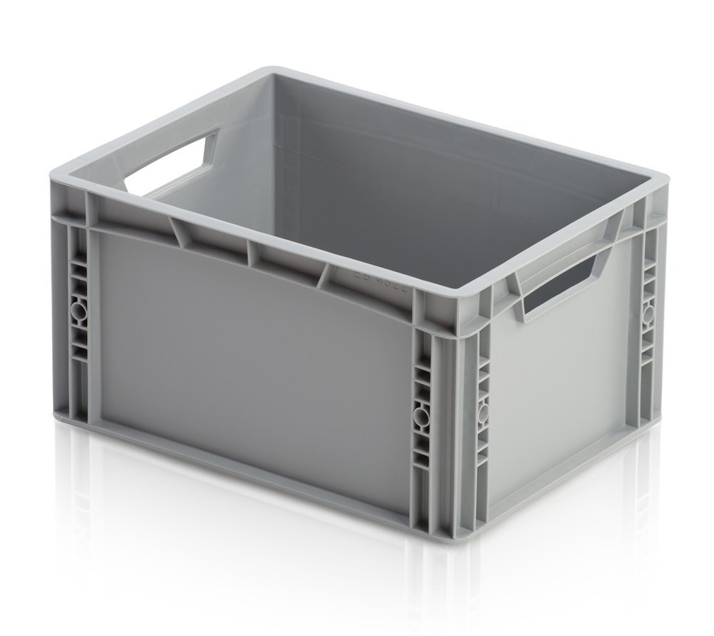 Skrzynia europejska z możliwością układania w stosy, odpowiednia do długotrwałego przechowywania i produkcji. Jest stabilny w transporcie, kompatybilny z europaletami. Posiada solidne dno i boki z zamykanymi uchwytami. Kolor szary. Objętość 54 l.