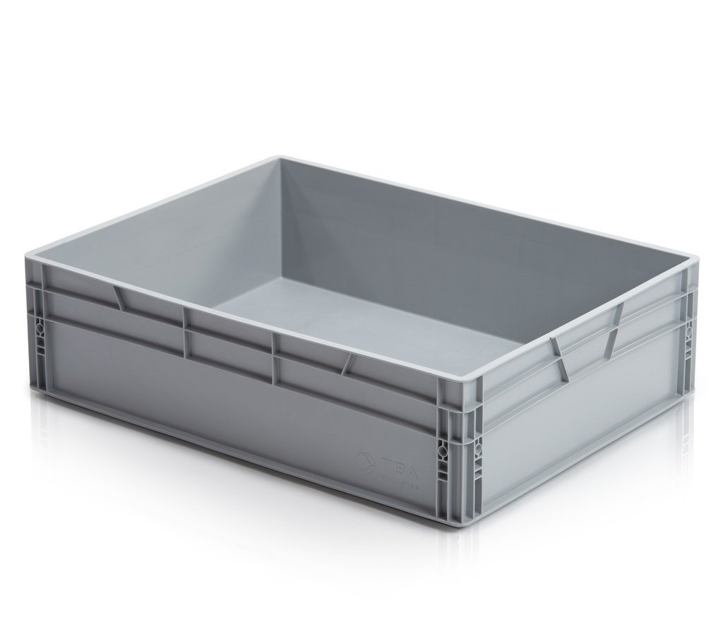 Skrzynia europejska z możliwością układania w stosy, odpowiednia do długotrwałego przechowywania i produkcji. Jest stabilny w transporcie, kompatybilny z europaletami. Posiada solidne dno i boki z zamykanymi uchwytami. Kolor szary. Pojemność 67 l.
