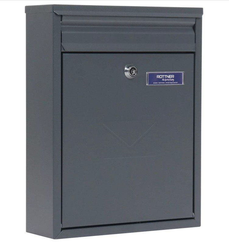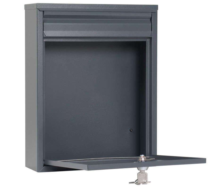 Skrzynka pocztowa, kolor antracytowy, przód i tył. Wysokość 320 x szerokość 250 x głębokość 85 mm. Prostokątne powierzchnie - pudełko nadaje się do różnych kompozycji.