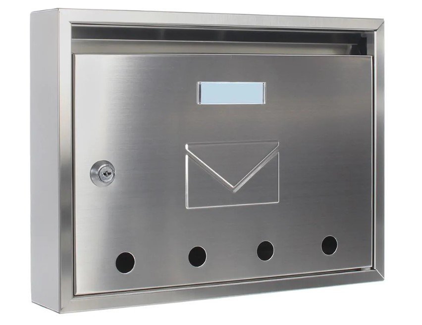 Skrzynka pocztowa, wykonanie ze stali nierdzewnej, do użytku wewnętrznego, do montażu, opadająca z przodu. Wysokość 240 x szerokość 320 x głębokość 60 mm.