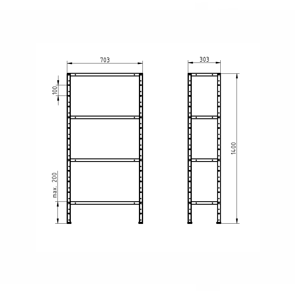 Regał śrubowy z metalu lekkiego przeznaczony do szerokiego zastosowania, wysokość 1500, szerokość 750, głębokość 300 mm. Nośność półki jest ustalona na maksymalne równomierne obciążenie 50 kg i służy do przechowywania lżejszych przedmiotów. Półki można dowolnie regulować w zakresie 50 mm. Prosty montaż za pomocą połączeń śrubowych.