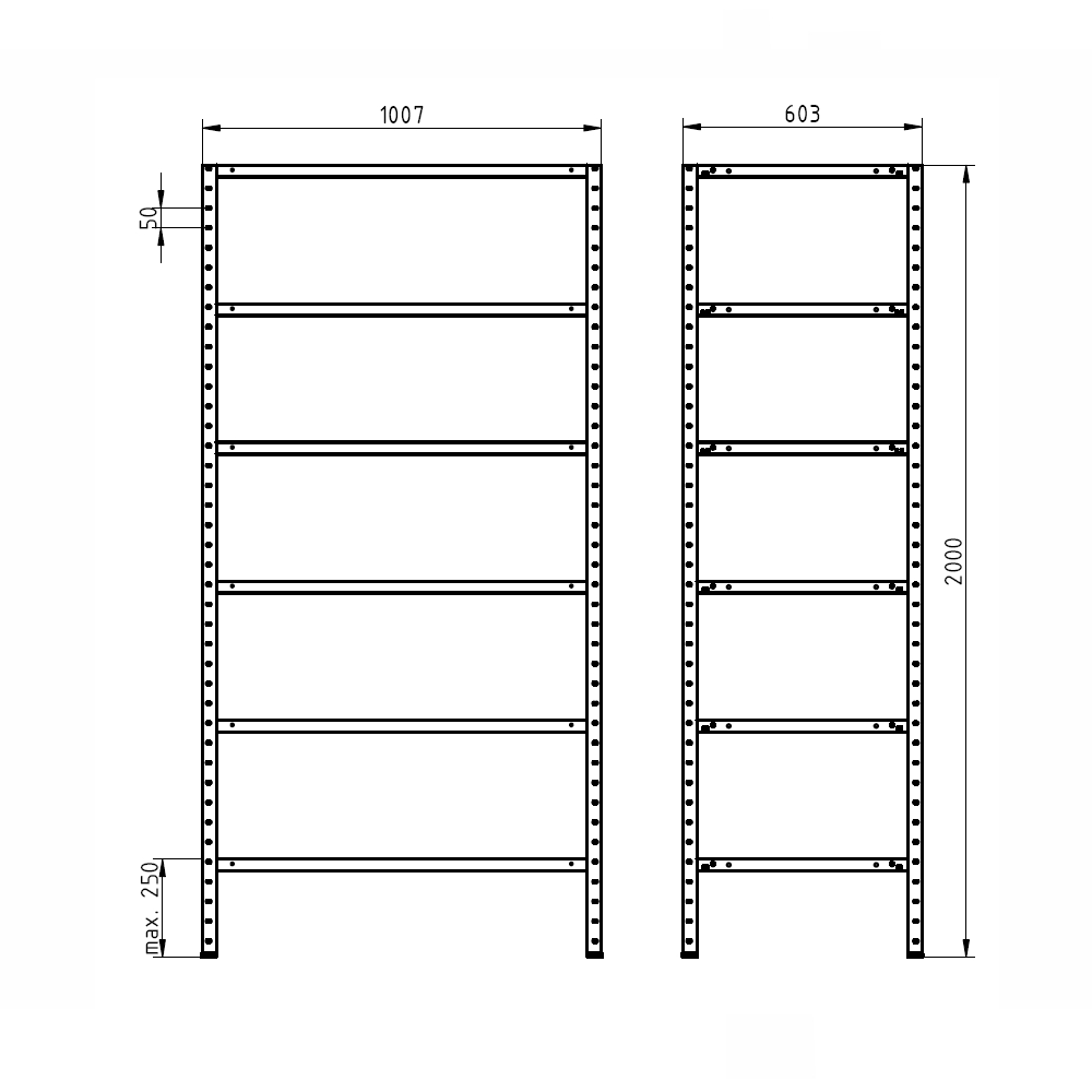 Metalowy regał śrubowy przeznaczony do szerokiego zastosowania w magazynach, archiwach, garażach, biurach i innych pomieszczeniach magazynowych. Wysokość 2000 mm, szerokość 1000 mm, głębokość 500 mm, 6 półek. Nośność półki jest ustalona na maksymalne równomierne obciążenie 250 kg i służy do przechowywania ciężkich przedmiotów. Prosty montaż za pomocą połączeń śrubowych.