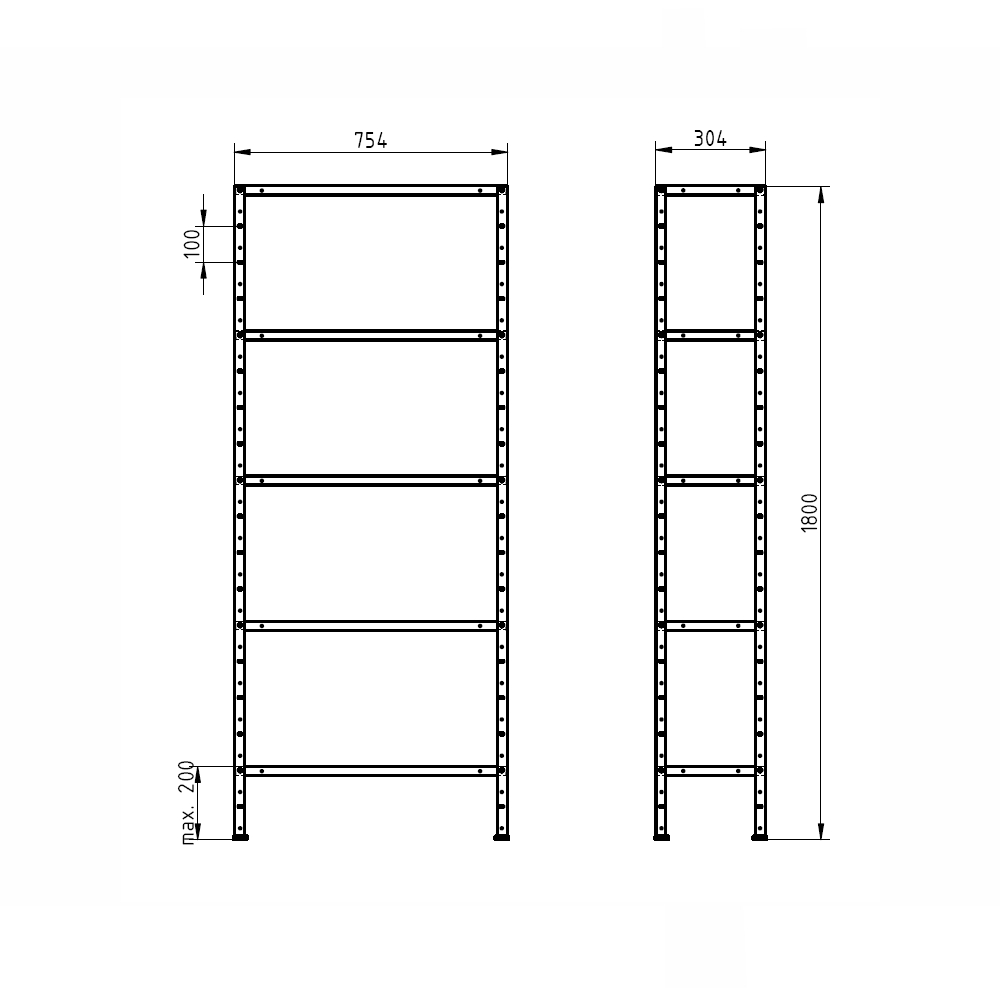 Regał śrubowy z metalu lekkiego przeznaczony do szerokiego zastosowania, wysokość 1800, szerokość 750, głębokość 300 mm. Nośność półki jest ustalona na maksymalne równomierne obciążenie 50 kg i służy do przechowywania lżejszych przedmiotów. Półki można dowolnie regulować w zakresie 50 mm. Prosty montaż za pomocą połączeń śrubowych.