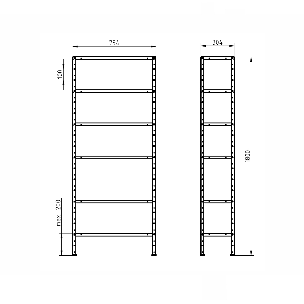 Regał śrubowy z metalu lekkiego przeznaczony do szerokiego zastosowania, wysokość 1800, szerokość 750, głębokość 300 mm. Nośność półki jest ustalona na maksymalne równomierne obciążenie 50 kg i służy do przechowywania lżejszych przedmiotów. Półki można dowolnie regulować w zakresie 50 mm. Prosty montaż za pomocą połączeń śrubowych.