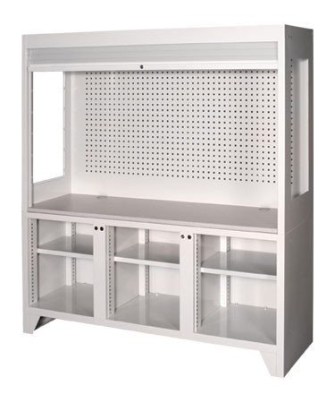Blat laminowany o grubości 28 mm, roleta samozwijająca z listwami aluminiowymi RAL 7035, boczne szkło hartowane, tylna ściana perforowana. Wysokość 2030, szerokość 1800, głębokość 600 lub 800 mm.