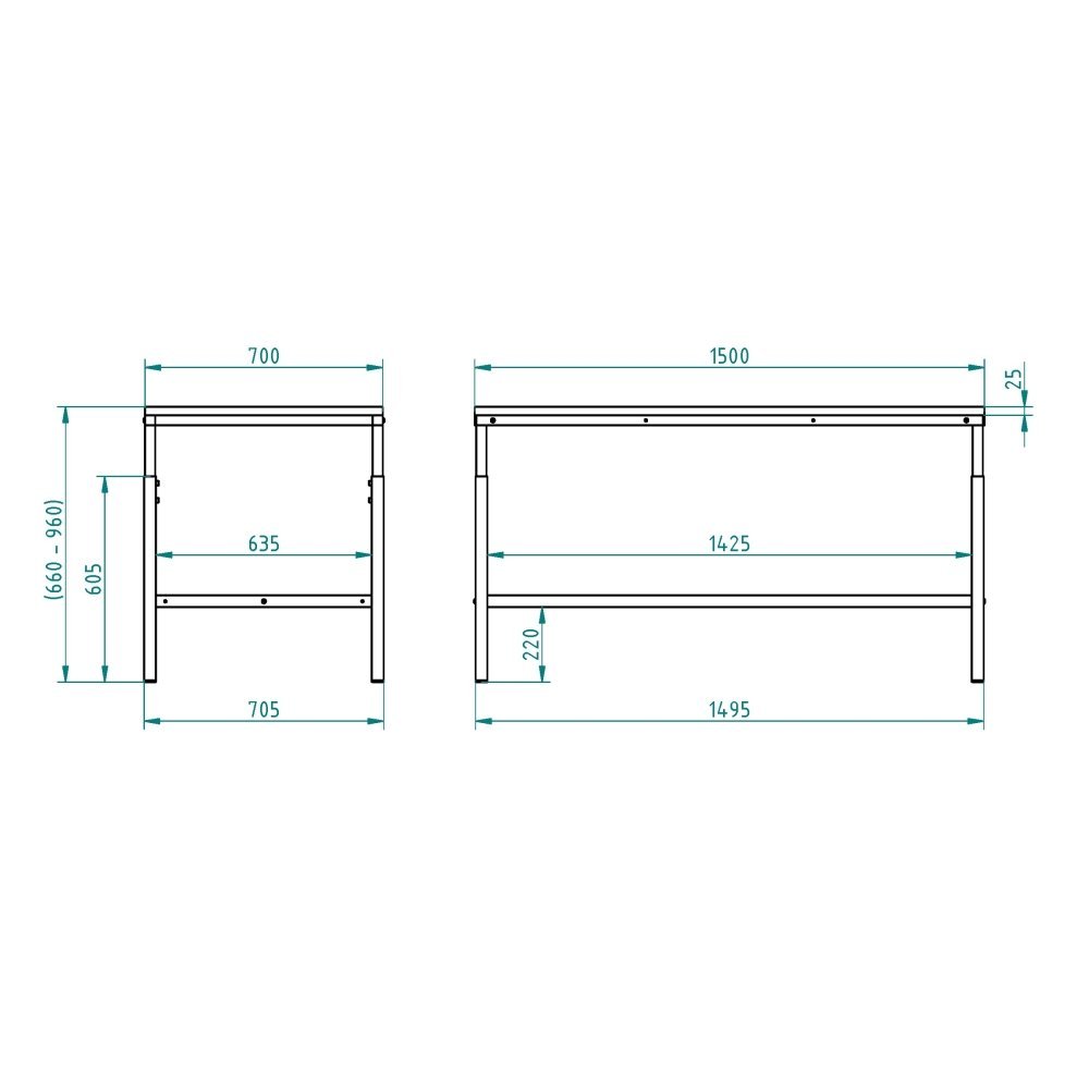 Konstrukcja półki regulowanej o głębokości 300 mm dla szerokości stołu 1500 mm. Bez półki.