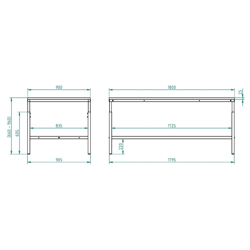 Konstrukcja półki regulowanej o głębokości 300 mm dla szerokości stołu 1800 mm. Bez półki.
