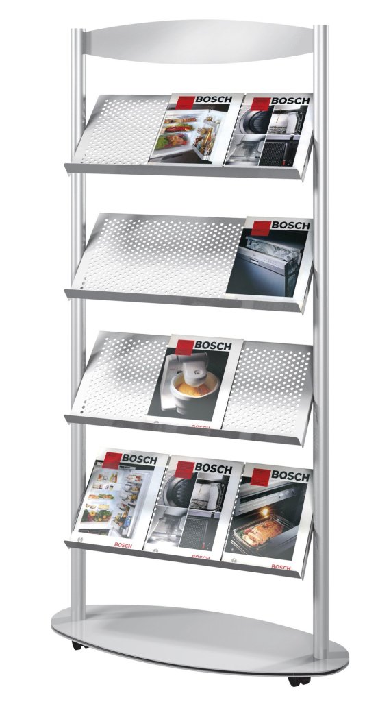 Stojak Ecoline typ 6356 do przechowywania broszur, pojemność 16x DIN A4. Konstrukcja stalowa z 4 półkami akrylowymi z dolną krawędzią 40 mm. W opakowaniu znajduje się folia „Info”. Mobilny na hamowanych kołach. Dolną półkę można przesuwać do pozycji poziomej. Wymiary 1600 x 910 x 350 mm.